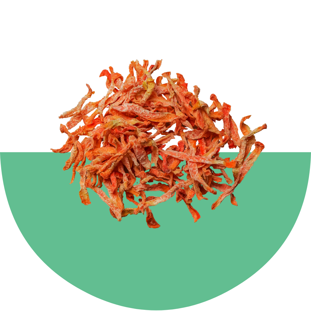 Protéines d'insectes séchées (23%), avoine nue (14%), riz blanc (14%), pois (14%), huile de colza (7%), citrouille séchée (7%), chicorée séchée, levure de bière séchée, extrait de levure, MOS (mannan-oligosaccharides), carottes séchées (0,5%), pommes séchées (0,5%), canneberges (0,01%).